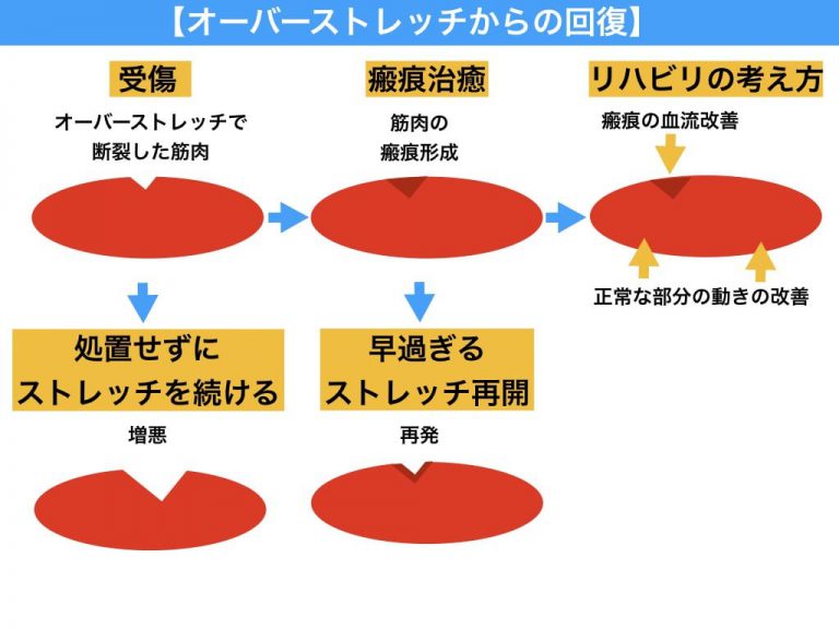 オーバーストレッチがなかなか治らない方は、この瘢痕治癒する前にストレッチを再開しているか、再開したストレッチの強度が強すぎる可能性がありますので、一度見直してみてください。
