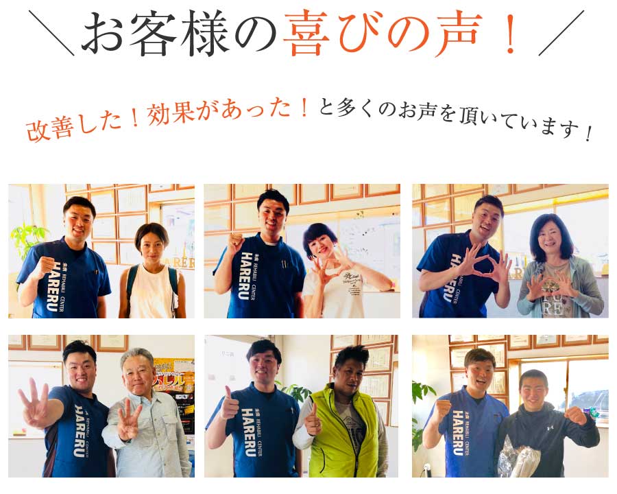 今までどこに行っても電気治療ばかりで何回通っても治りませんでしたがハレルは体全体を見てくれて、短期間で結果が出ました。