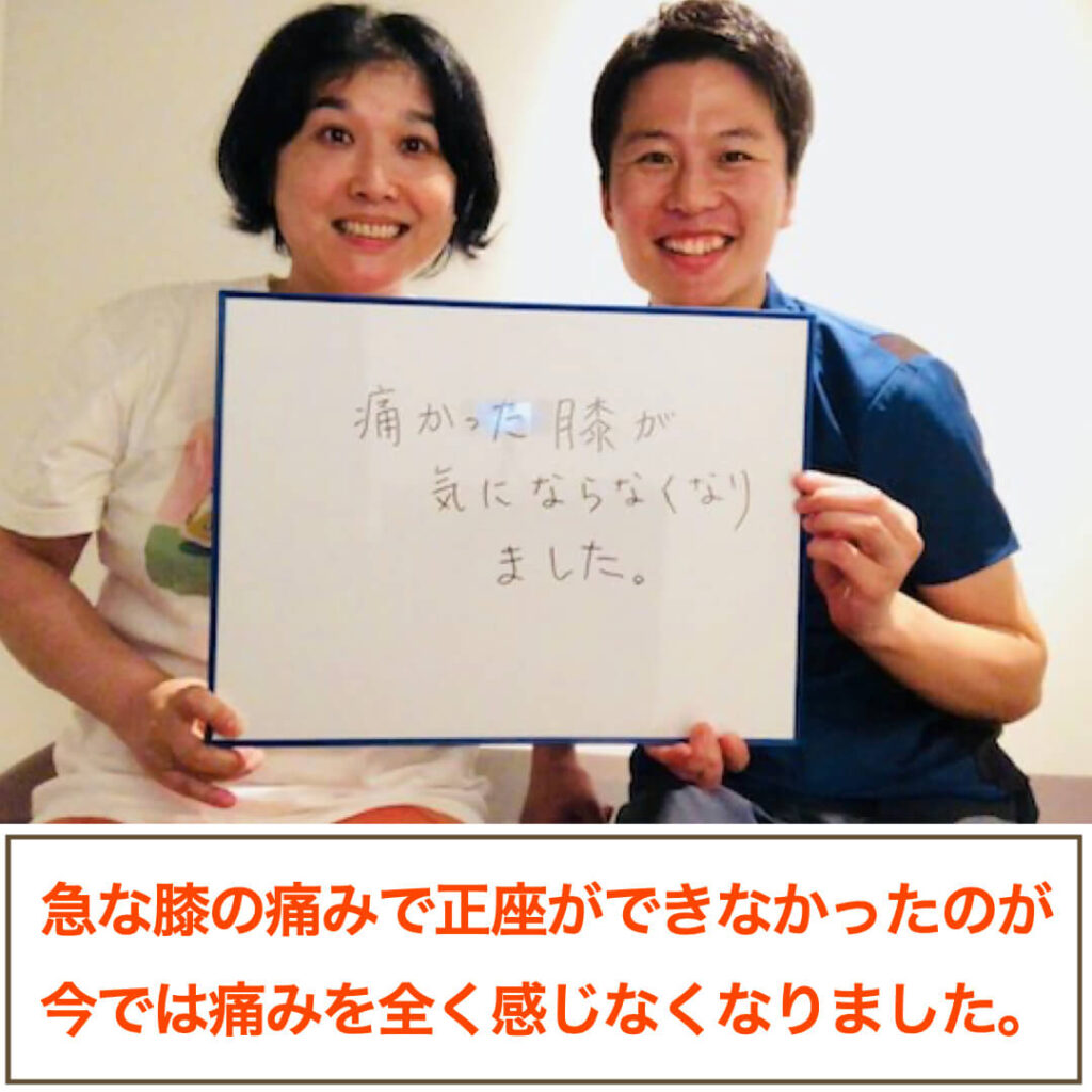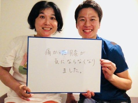 結果として1ヶ月程度の施術で、正座や歩き出しの時の痛みは全く無くなり、今では趣味のエアロビクスも楽しめるようになりました!