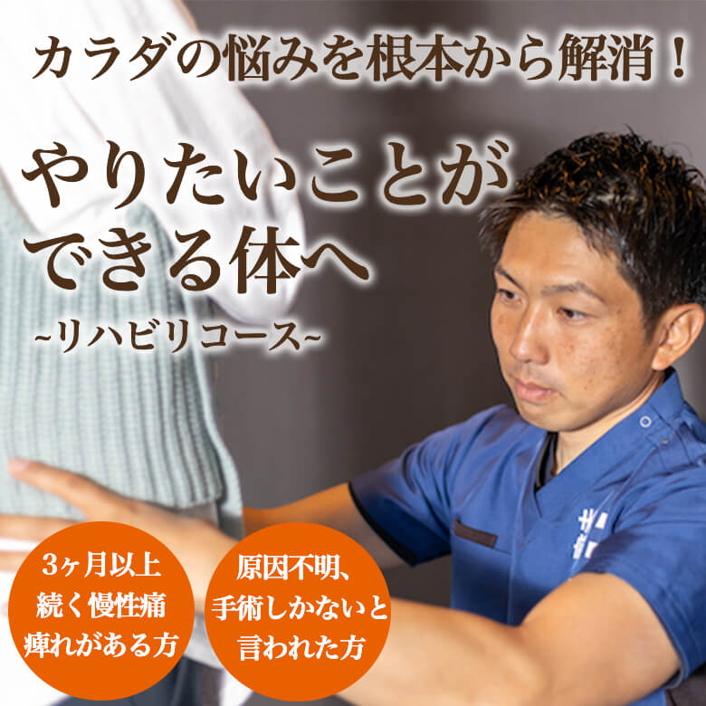 | リハビリコース 初回90分 (カウンセリング+施術+アフターフォロー含め) | 通常料金 8,800円 (税込) |