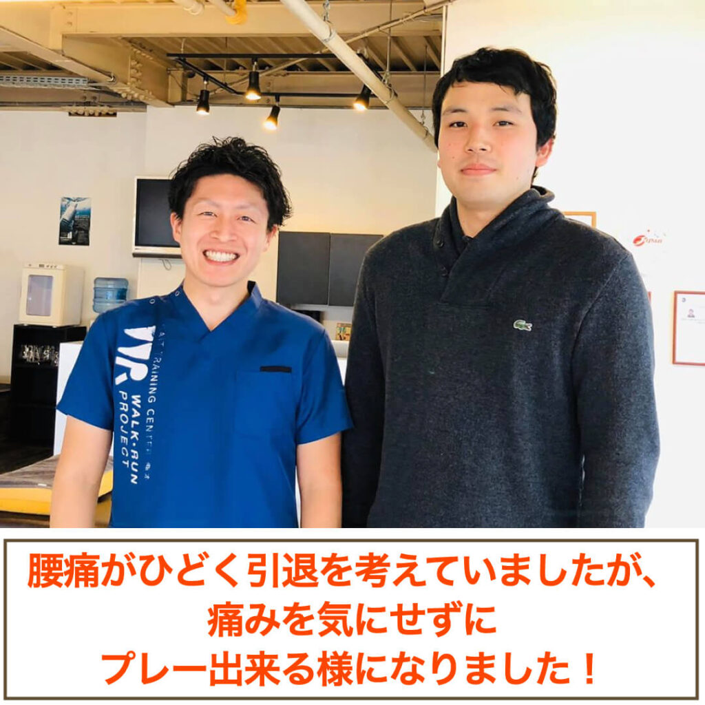 こちらでしっかりと筋肉をほぐしてもらったところ、以前痛みが出ていた動きも楽にとれるようになり今後も選手としてプレーが続けられそうです。