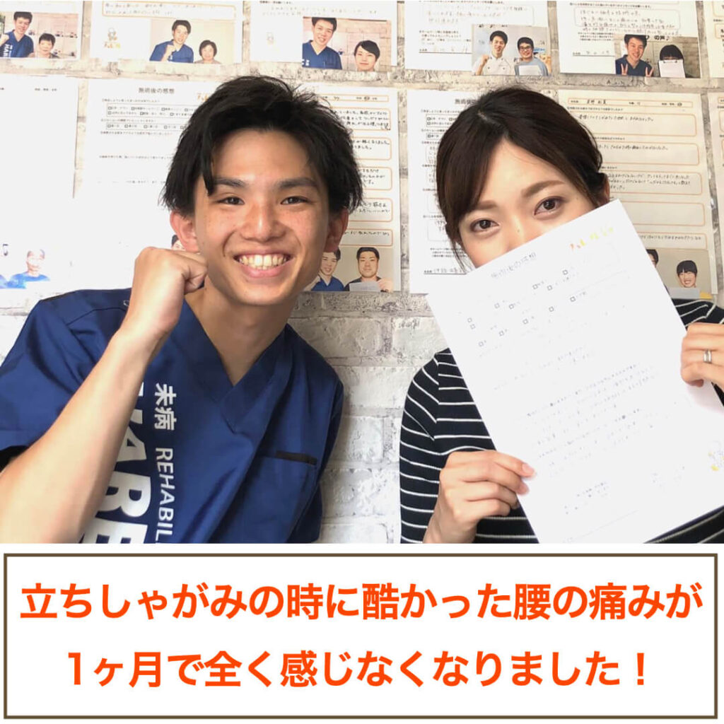 施術後には腰痛はなくなり、1ヶ月後に自宅に戻る前に安心して帰ることができました。