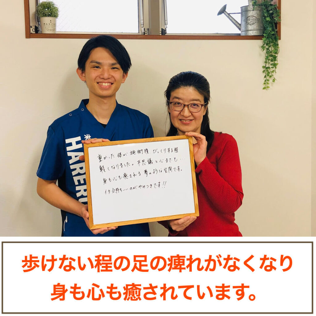 以前は歩けないくらいの足の痺れがあったのですが、施術後受けるにつれて、重かった体が施術後にびっくりする程、軽くなりました!